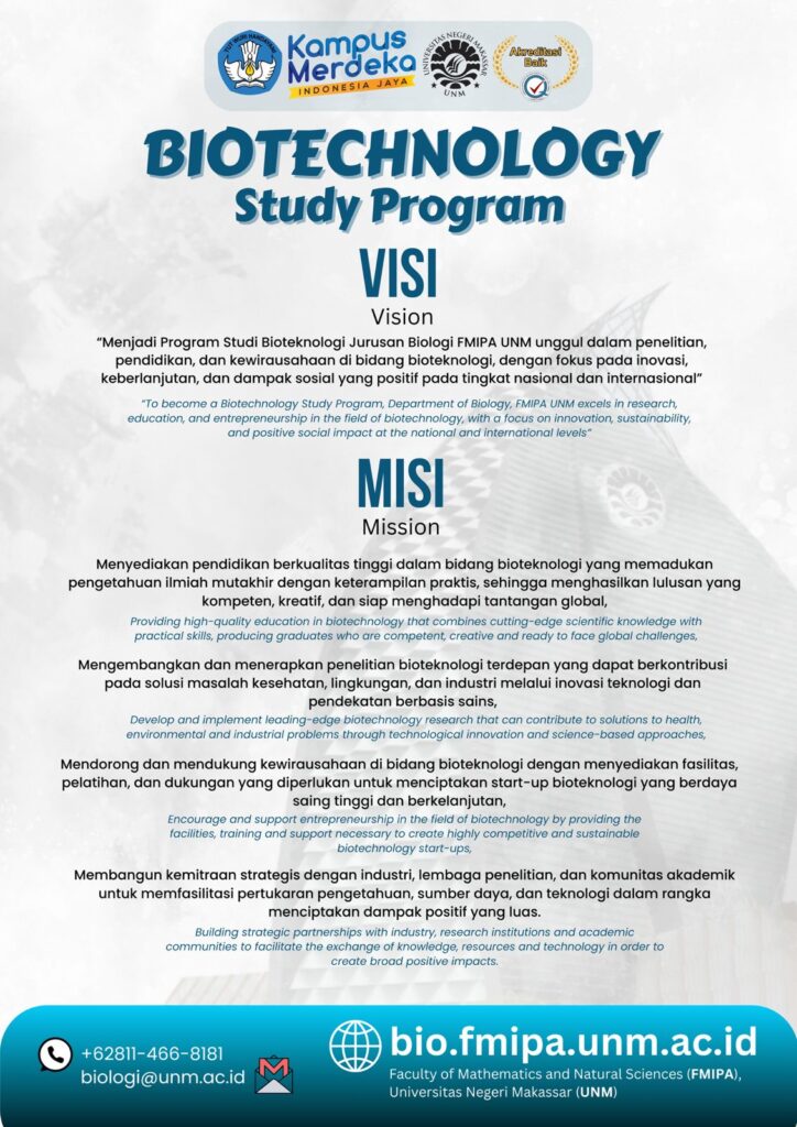 Menjadi Program Studi Bioteknologi Jurusan Biologi FMIPA UNM unggul dalam penelitian, pendidikan, dan kewirausahaan di bidang bioteknologi, dengan fokus pada inovasi, keberlanjutan, dan dampak sosial yang positif pada tingkat nasional dan internasional.